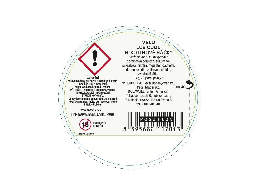 Charakteristika příchutě: Intenzivní ledově chladivá chuť varianty VELO Ice Cool. Je stejně mrazivá jako zimní den v Alpách se svěžími tóny máty a dalších bylin. Extra silné.