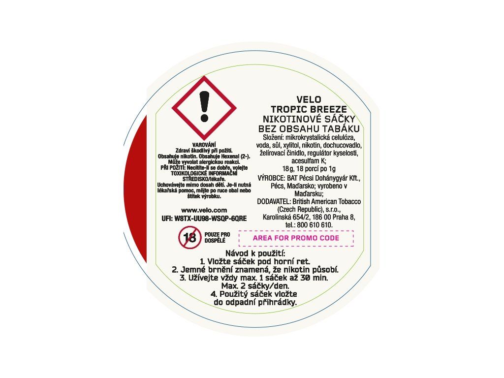 Každé balení VELO obsahuje 20 nikotinových sáčků, vyrobených bez příměsi tabáku. Původní nápad ze Švédska obsahuje pouze nikotin, vodu, příchutě a vlákna, která drží konzistenci. Nikotinové sáčky VELO se vyznačují extrémní jednoduchostí používání. Jednoduše umístíte sáček pod horní ret a necháte jej tam po dobu 5-10 minut, než pocítíte nástup nikotinu. Každý sáček můžete používat až po dobu 30 minut.